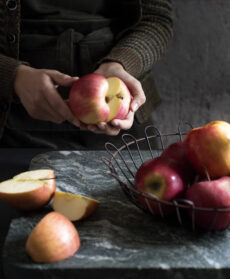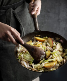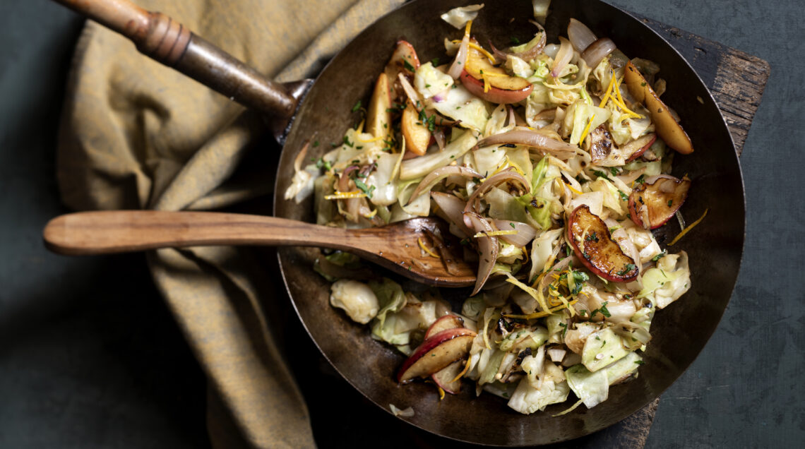 Tagliate la scorza dell'arancia e del limone a julienne, sbollentatele per 30 secondi in acqua in ebollizione, scolatele e tenetela da parte. Tagliate il cavolo, privato del torsolo, a strisce larghe circa 3 cm. Sbucciate le cipolle e tagliatele a spicchi di 1 cm di spessore. Lavate le mele, privatele del torsolo e dividetele in 8 spicchi ciascuna.