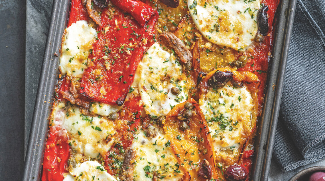3 Oliate una teglia rettangolare e disponetevi a strati i peperoni, la bufala, le olive, i capperi sgocciolati, i filetti di acciuga e un po' di pangrattato aromatico: abbiate cura di terminare con bufala e pangrattato. Condite con un filo d'olio e infornate a 200° per 15 minuti.