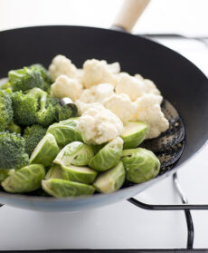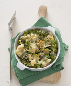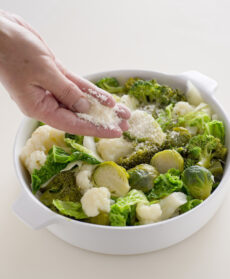 Pulite e lavate tutti i cavoli. Disponete il cestello per la cottura al vapore nella pentola e riempitela con acqua, fino a sfiorarne il fondo. Portatela a bollore, mettete nel cestello i cavollini tagliati a metà nel senso della lunghezza, le cimette di broccoli e i cavolfiori e cuocete, con il coperchio, per 5-6 minuti. In una padella antiaderente cuocete con il coperchio la verza e il cavolo cappuccio con un pizzico di sale. Riunite tutti i cavoli, regolate di sale e pepe e irrorate con un filo di olio. Trasferite le verdure nella pirofila.