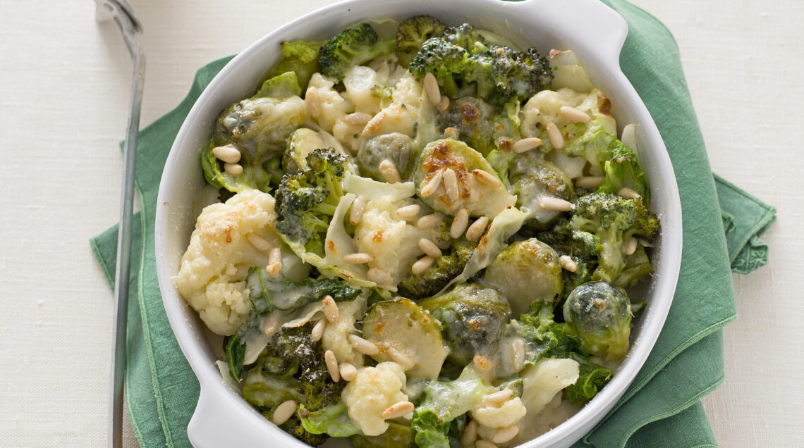 Cavolfiore, cavolini e cavolo cappuccio, arricchiti da pinoli e profumati con noce moscata