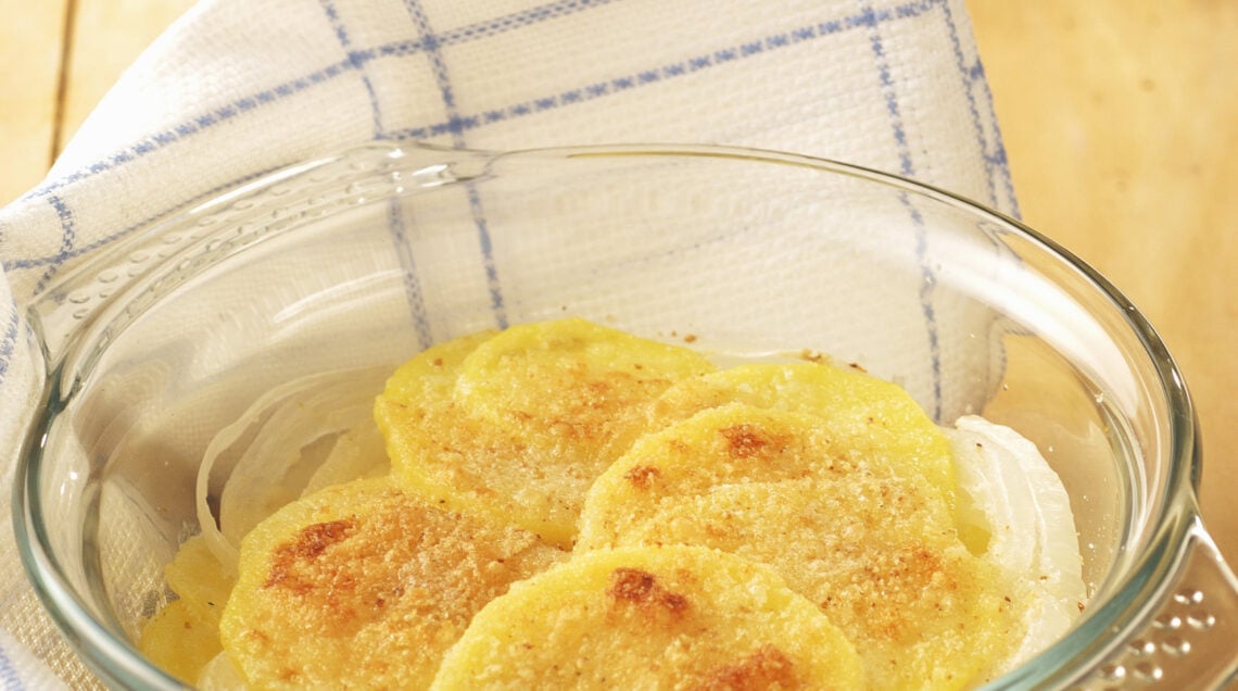 1) Per preparare il gratin di patate, alterna in una pirofila unta di olio 400 g di patate e 2 cipolle affettate, versavi sopra 200 g di panna mescolata con 20 g di grana e un pizzico di sale.