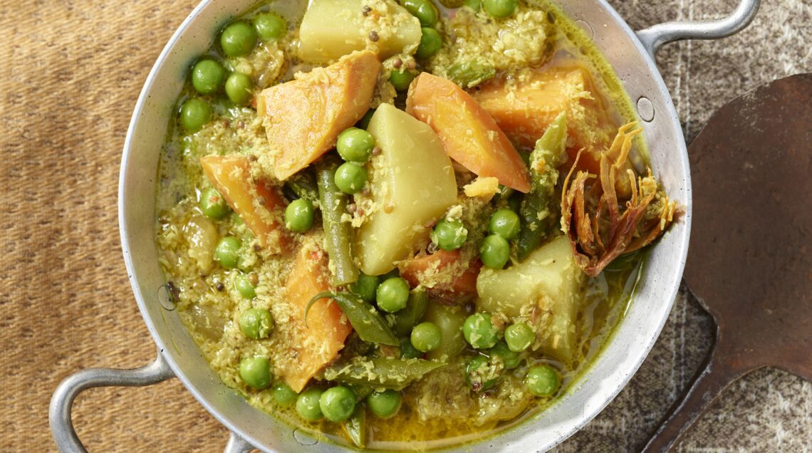 3) Unisci le verdure secondo i loro tempi di cottura: comincia con le carote pulite e tagliate a tocchetti, dopo 5 minuti metti le patate sbucciate, lavate e tagliate in grandi spicchi, dopo altri 5 minuti i fagiolini spuntati e alla fine i piselli. Togli dal fuoco appena le verdure saranno cotte, in modo che restino sode. Profuma con una spruzzata di lime, l'asafoetida e servi il curry di verdure alla maniera di Goa.