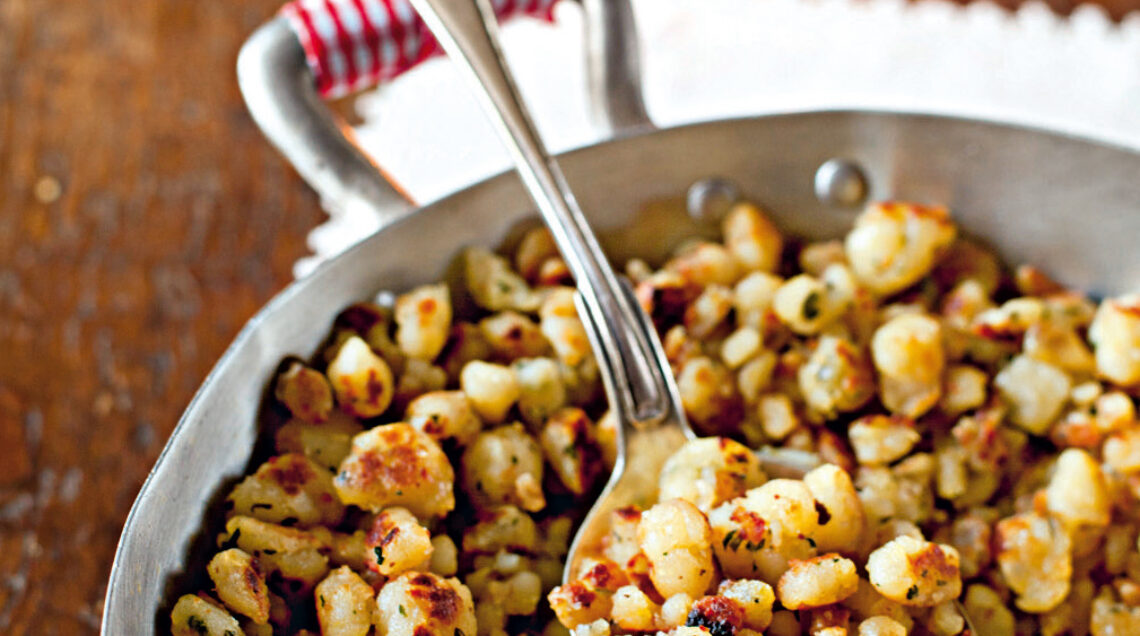 3) Sciogli metà del burro in una larga padella e quando sarà spumeggiante unisci il composto di patate. Rosola a fuoco medio alto, aggiungendo il burro restante poco alla volta, finché i maluns saranno dorati e croccanti. Per mescolarli, soprattutto all’inzio della cottura, non usare il cucchiaio (che li schiaccerebbe compattandoli), ma scuoti la padella. Servite i maluns come ricco contorno.