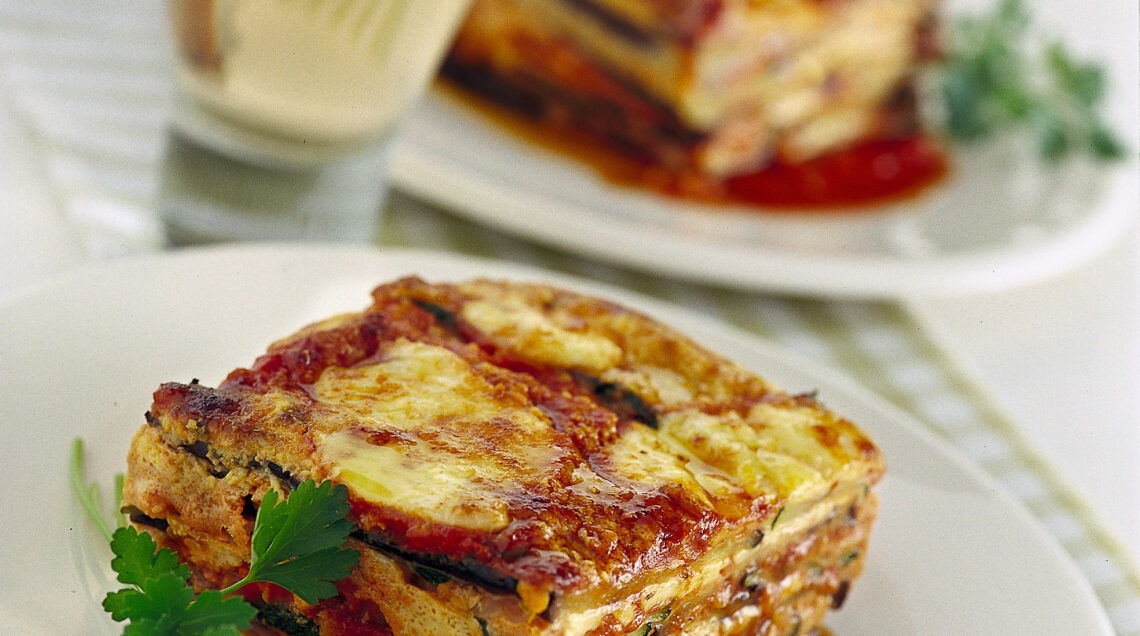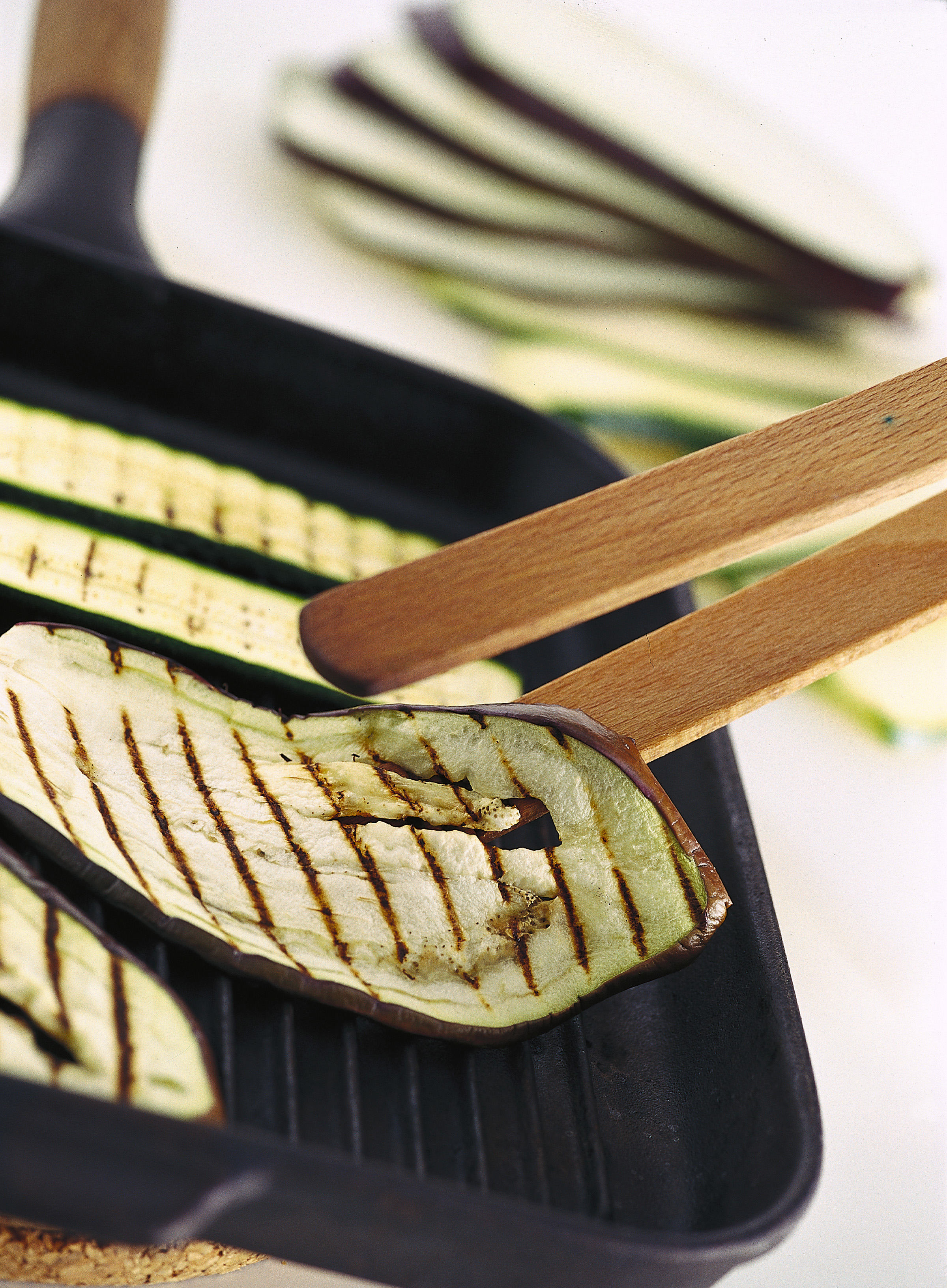 2) Lava le zucchine, riducile a fette alte mezzo cm e grigliale. Cuoci allo stesso modo anche le melanzane lavate e asciugate. Sbatti le uova con un pizzico di sale e 4 cucchiai di sugo di pomodoro.