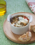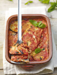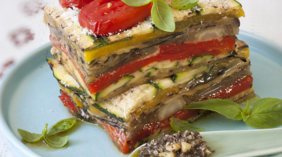 3) Continua alternando gli strati fino a esaurimento degli ingredienti. Infine ricopri la superficie con i pomodorini. Lascia riposare una notte in frigorifero con un peso appoggiato sopra, in modo da compattare gli ingredienti.
