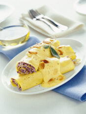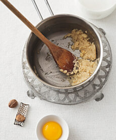 Prepara la besciamella. Fai sciogliere il burro a fiamma bassa, toglilo dal fuoco, unisci la farina e mescola con una frusta fino a ottenere una crema. Versa a filo il latte sempre mescolando con la frusta e fai addensare sul fuoco. Poi incorpora il tuorlo, sala e profuma con un po’ di noce moscata.