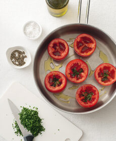 Togli la calotta ai pomodori, svuotali e condiscili all’interno con olio, sale, pepe e poco prezzemolo tritato. Cuocili in un tegame con un filo d’olio per 5 minuti a fuoco alto e con il coperchio.