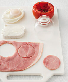 Con un bicchiere non troppo largo, intaglia le fette di mozzarella in modo da ottenere 6 piccoli dischi. Fai lo stesso con il prosciutto. Disponi i pomodori in una teglia con poco olio e farciscili con la mozzarella, il prosciutto, le uova e un po’ di besciamella.