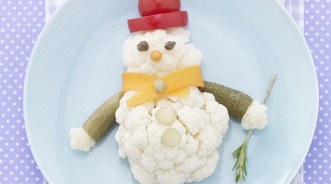 1) Lavate il cavolfiore in acqua fredda, eliminate le foglie e il gambo centrale. Dividetelo a ciuffi per ottenerne 4 grossi, di dimensioni simili, per i corpi dei pupazzi, e altri 4 leggermente più piccoli per le teste.