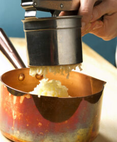 A mano a mano che le sbucciate, passate le patate ancora calde allo schiacciapatate, raccogliendo il passato in una casseruola; regolate di sale, profumate con noce moscata, unite il burro a pezzetti e mescolate energicamente per farlo sciogliere.