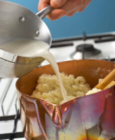 Mettete la casseruola su fuoco basso, versate a filo il latte caldo e continuate a cuocere per 5-6 minuti, sbattendo bene con una forchetta o una frustina, in modo da incorporare aria e ottenere un purè soffice.
