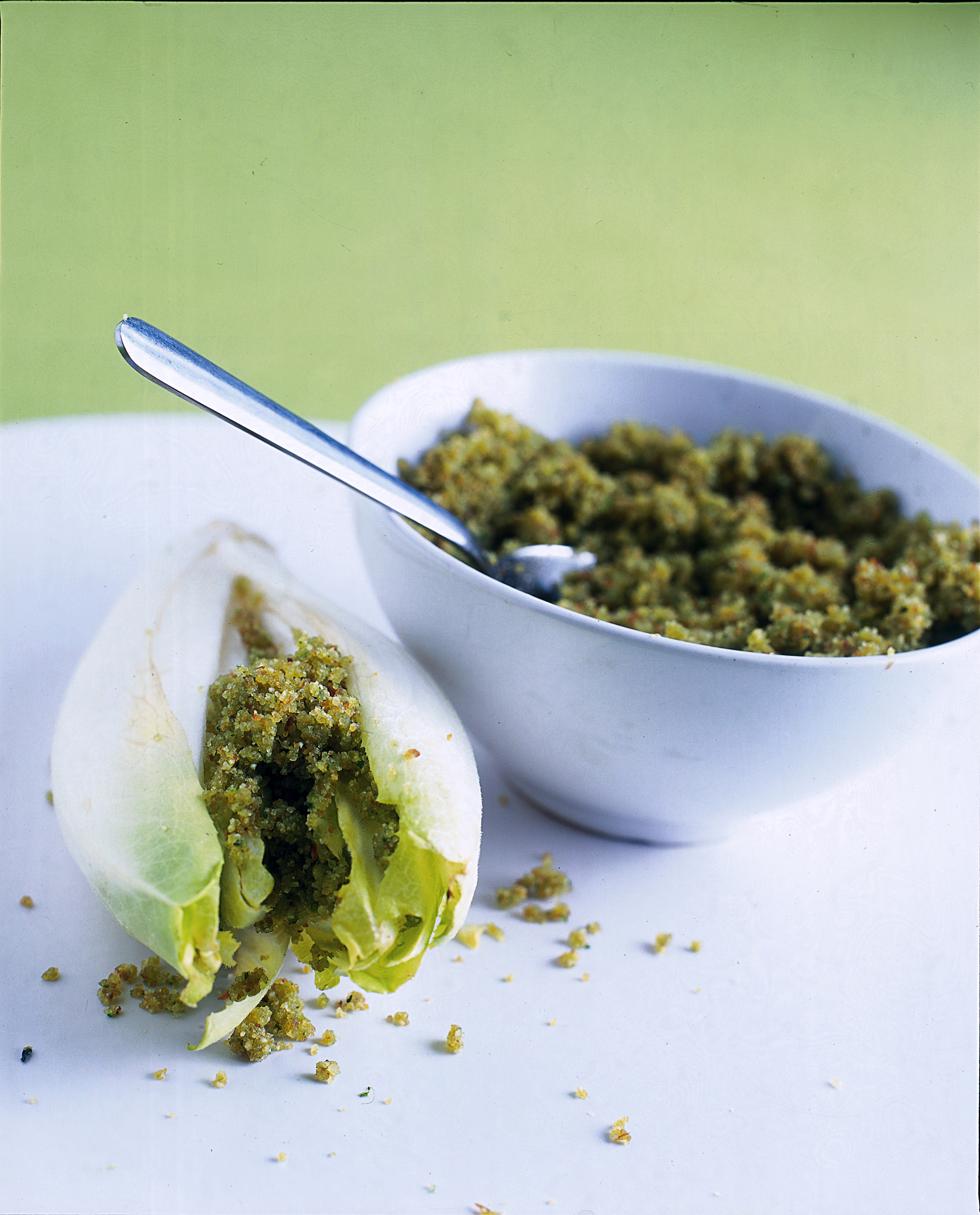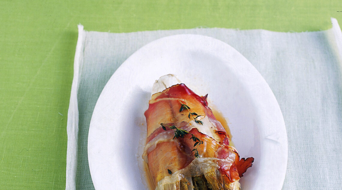 1) La ricetta degli arrostini di indivia belga inizia frullando il pangrattato con aglio, prezzemolo, un po’ di timo. Aggiungi del formaggio, un po’ di speck, il burro e un po’ di pepe nero. Prendi l'indivia, puliscila bene e tagliala a metà nel senso della lunghezza. Lascia unita la parte finale, lì dove si trova il cespo. Apri l’indivia e distribuisci all’interno il composto. Avvolgi infine con lo speck rimasto ed aggiungi un po’ di timo.