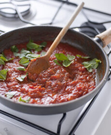 Sbucciate aglio e cipolla, tritateli e fateli appassire in padella, a fuoco basso, con 3 cucchiai di extravergine. Unite i pomodori pelati tagliuzzati con le forbici, un pizzico di sale e uno di zucchero e cuocete la salsa per 20 minuti, finché sarà densa. Regolate di sale, pepate, spegnete il fuoco e profumate con un po' di basilico spezzettato; lasciate intiepidire. Intanto, tagliate la mozzarella a dadini e fateli asciugare su carta da cucina.