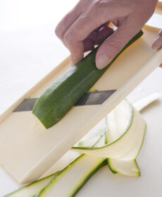 Lavate zucchine e peperoni. Spuntate le prime e riducetele a nastri sottili con la mandolina. Tagliate i peperoni a metà nel senso della lunghezza dividendo anche i piccioli e puliteli internamente. Infarinate le zucchine e friggetele, poche alla volta, in abbondante olio di arachidi bollente. Sgocciolatele via via su carta da cucina e salatele.