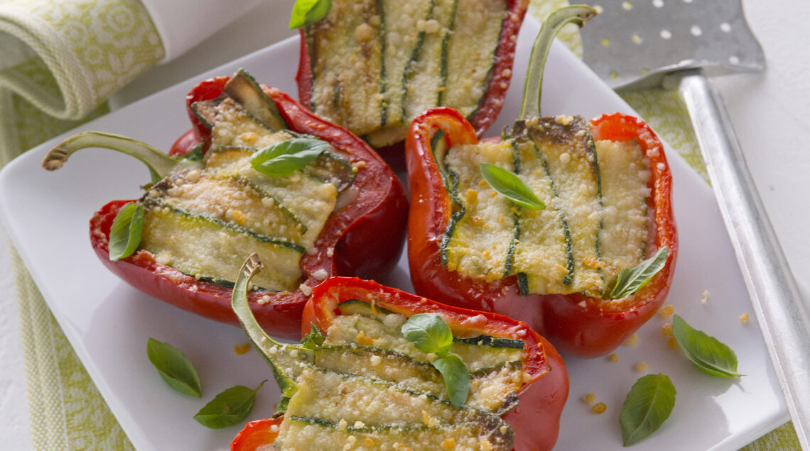 Sbattete l'uovo con un pizzico di sale e mescolatelo con il sugo di pomodoro. Versate 1 cucchiaio di salsa sul fondo dei mezzi peperoni e riempiteli alternando fette di zucchina, mozzarella, salsa e parmigiano. Ripetete gli strati fino a esaurire gli ingredienti e avendo cura di terminare con zucchine e parmigiano. Cuocete le barchette in forno caldo a 200° per 30 minuti. Servitele tiepide.