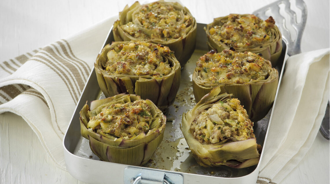 3 Disponete i carciofi in una pirofila unta d’olio. Allargate le foglie al centro e farcitele con il composto di carne. Versate il brodo sul fondo della pirofila, coprite con un foglio di alluminio e infornate a 180° per 30 minuti. Eliminate l’alluminio, cospargete con il parmigiano, irrorate d’olio e gratinate i carciofi per altri 10-15 minuti.