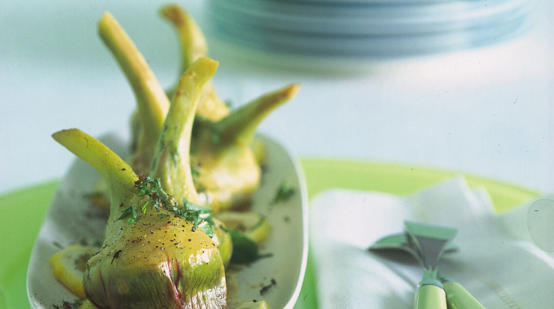2) Unisci 8 carciofi interi puliti con i gambi verso l'alto e irrora con 1 dl di vino bianco e il succo di 1 limone.