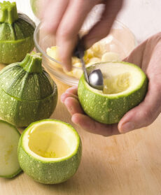 Per preparare i cestini di zucchine, è necessario scavare e svuotare le zucchine. Acquista zucchine più o meno della stessa dimensione e controlla che siano ben sode: così troverai all'interno pochi semi e la polpa sarà più saporita. Lava 4 zucchine rotonde, asciugale e taglia via la calottina. Svuota le zucchine con uno scavino, asporta ed elimina i semi e poi elimina anche parte della polpa. Fai attenzione a lasciare attaccata alla buccia più o meno un cm di polpa. Prendi i cestini e i coperchietti di zucchine e scottali in acqua in ebollizione salata per circa 5-6 minuti. Scolali e lasciali raffreddare nel colapasta. Se siete in possesso di una pentola a vapor usatela per la precottura dei cestini di zucchine. L'operazione richiede un po' più di tempo ma i cestini manterranno meglio la forma senza perdere il gusto originale. Per guadagnare tempo cuoci i cestini in anticipo, lasciali raffreddare e tienili in frigorifero coperti con pellicola.