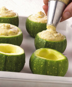A questo punto puoi farcire le zucchine prima di preparare i cestini ripieni. Recupera il ripieno preparato e, con l'aiuto di una tasca da pasticciere con una bocchetta liscia, farcisci le zucchine.