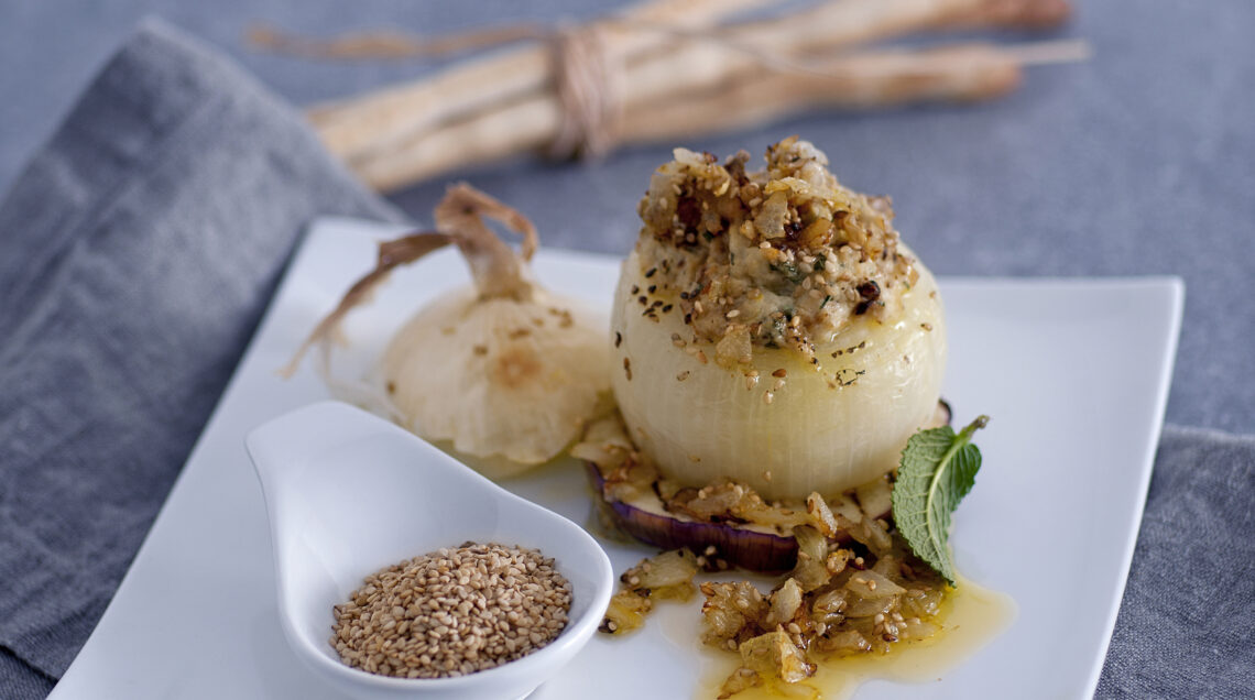 2) Priva le cipolle della calottina, sbucciale e cuocile a vapore per 15 minuti. Svuotale un po’, trita la polpa e cuocila per 10 minuti in un tegame coperto con 3 cucchiai di olio, i semi di sesamo, sale e pepe. Farcisci le cipolle svuotate con la crema preparata e copri con la polpa di cipolla al sesamo.