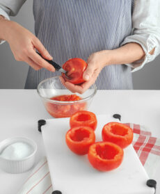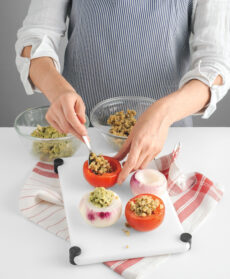 Pomodori e cipollotti hanno due ripieni diversi per favorire altrettanti incontri di sapori. Per i primi, che in cottura diventano molto cedevoli, serve una farcia piuttosto compatta, quindi diluita con poco olio. Le cipolle, al contrario, che hanno una struttura più robusta, si avvantaggiano di un ripieno morbido, abbondantemente oliato.
