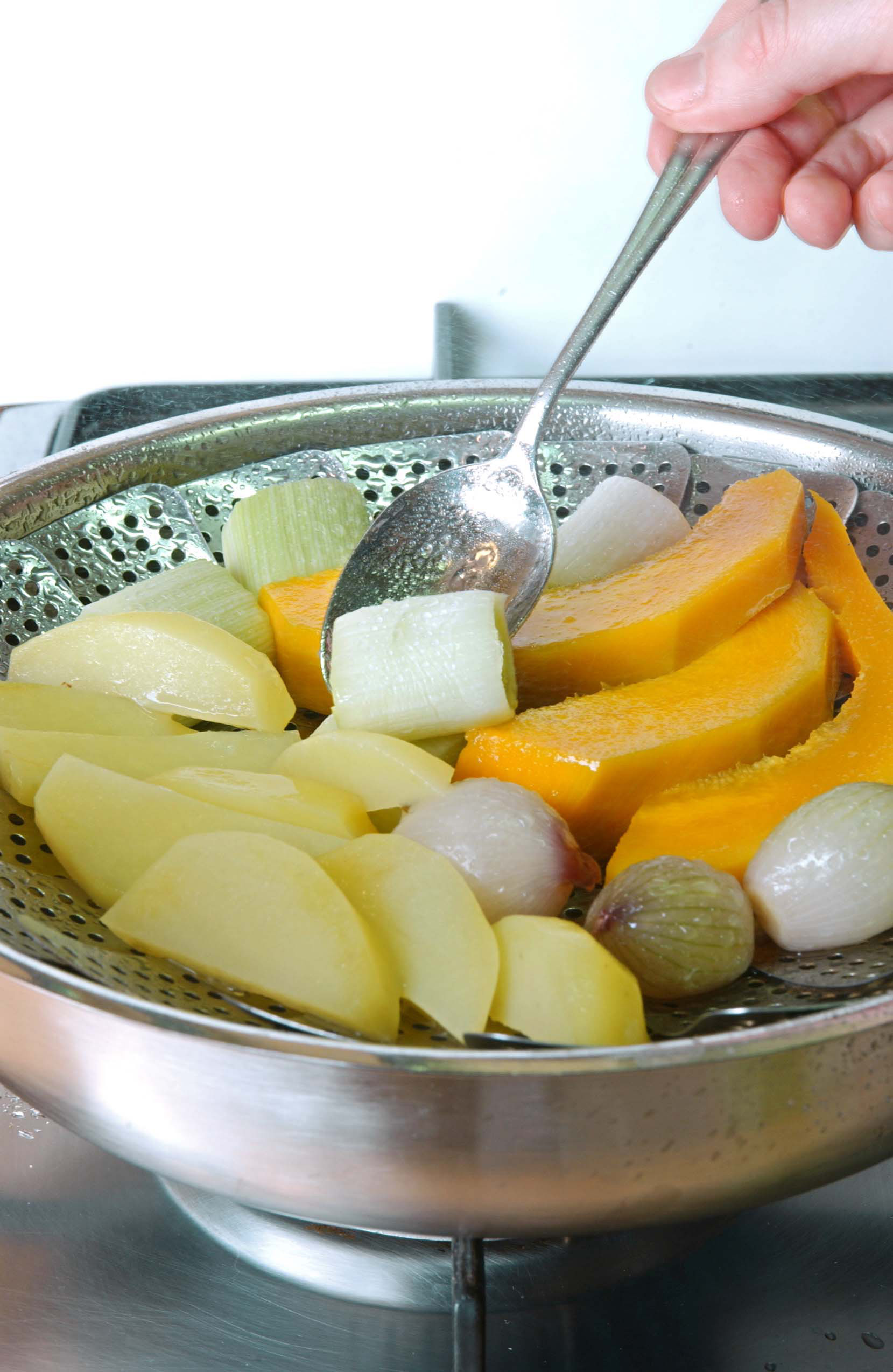 3) Metti sul fuoco la vaporiera e aggiungi una alla volta le verdure precedentemente tagliate da impiegare per la ricetta gran misto dell’orto. Tieni d’occhio i tempi di cottura per ottenere un risultato uniforme. Parti dalla zucca, che richiede 15 minuti di tempo e dopo qualche minuto inserisci gli spicchi di patata. Attendi ancora un po’ prima di aggiungere gli scalogni e infine i porri.