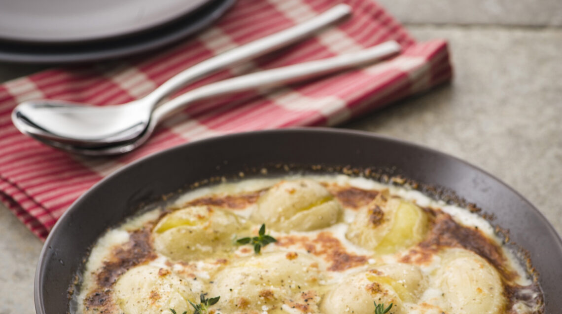 4) Completa la ricetta del gratin di patate e gorgonzola dolce con qualche fiocchetto di burro e gratina in forno per una decina di minuti. Pepa a piacere e completa con qualche fogliolina di timo.