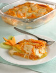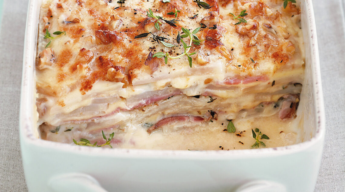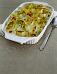 4) Prosegui con gli strati fino a esaurire gli ingredienti terminando con sedano rapa, besciamella e noci. Cospargi di grana, ultima con il burro rimasto a fiocchetti e passa nel forno caldo a 200° per 20 minuti. Il gratin di sedano rapa al prosciutto è pronto!