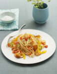 3) Lessa la pasta dal formato piccolo (tipo farfalle) per il tempo indicato sulla confezione. Scolala al dente, condiscila con la polpa di pomodoro e farcisci con questa i peperoni.