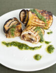 Servi le melanzane con friggitelli, pomodori e provola affumicata quando sono ancora calde o tiepide, accompagnate da una birra ghiacciata o da un buon vino rosso d’annata.