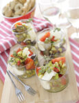 3) Taglia la burrata a metà e una delle due metà a tocchetti; metti su un piatto un coppapasta (almeno 10 cm), sistemaci dentro una fetta di melanzana, cospargi con un velo di grana, ricopri con una o più fette di pomodoro, un po' di cipolla, basilico e qualche tocchetto di burrata. Ripeti gli strati fino a ottenere una torretta, quindi sfila il coppapasta e componi altre 3 torrette.