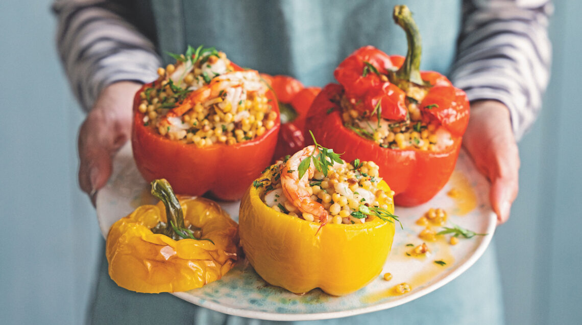 2 Sgusciate i gamberi (non buttate i carapaci), tenetene da parte 4 interi, spezzettate i restanti e conditeli con sale, un po' di erbe e succo di limone. Mescolateli con la fregola e le erbe rimaste. Disponete il composto nei peperoni, completate con i gamberi tenuti parte e le calotte e infornate a 180° per 20 minuti.