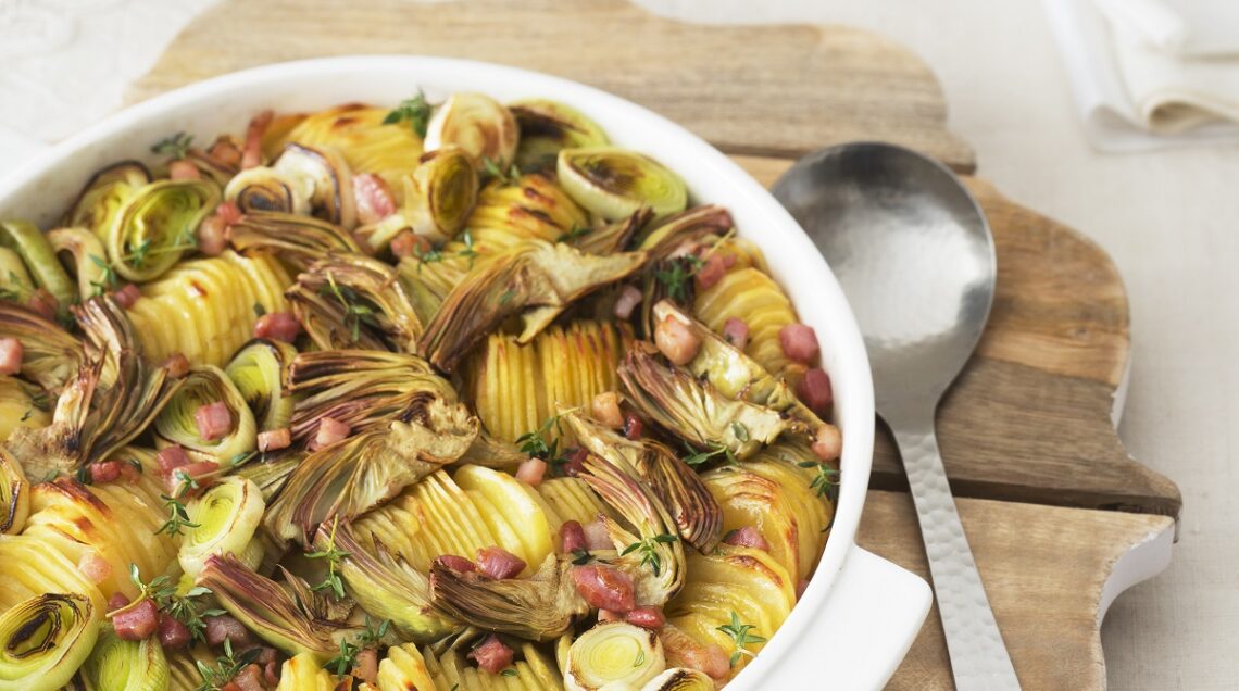 Pirofila di patate, carciofi e porri con pancetta affumicata e timo, la preparazione