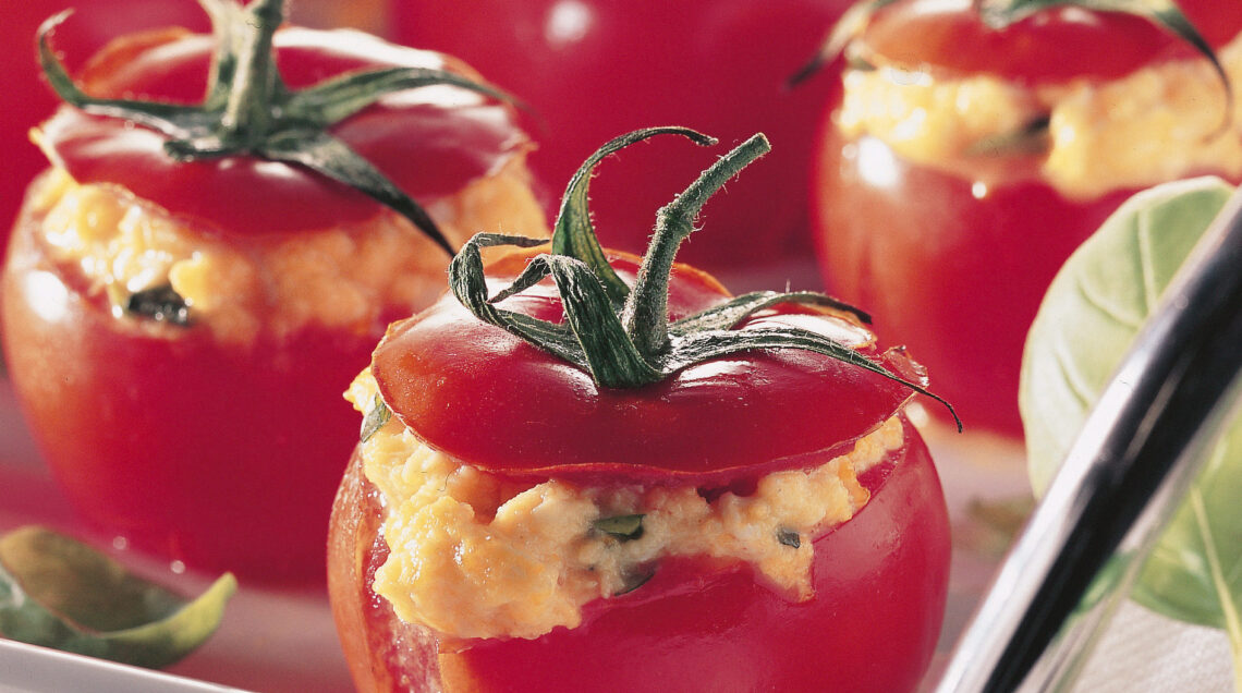4) Distribuite il composto di uova nei pomodori, aggiungete qualche fogliolina fresca di basilico, chiudete con le calottine e servite subito i pomodori ripieni con uova e ricotta.