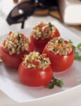 1) Lavate i pomodori, asciugateli e tagliate la calotta superiore. Svuotateli dei semi e lasciateli sgocciolare su una gratella per 30 minuti, in modo che perdano l'acqua di vegetazione. Scaldate il forno a 180°.