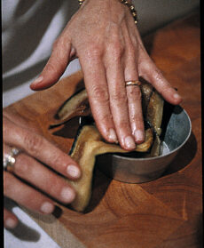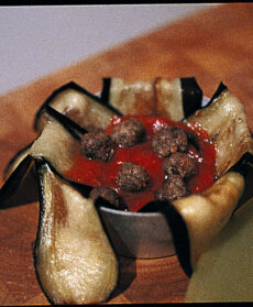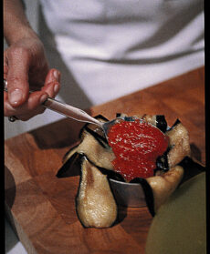 Per realizzare la ricetta dei timballini di melanzane innanzitutto fodera con fette di melanzana fritte degli stampini a bordi alti, facendole sbordare.