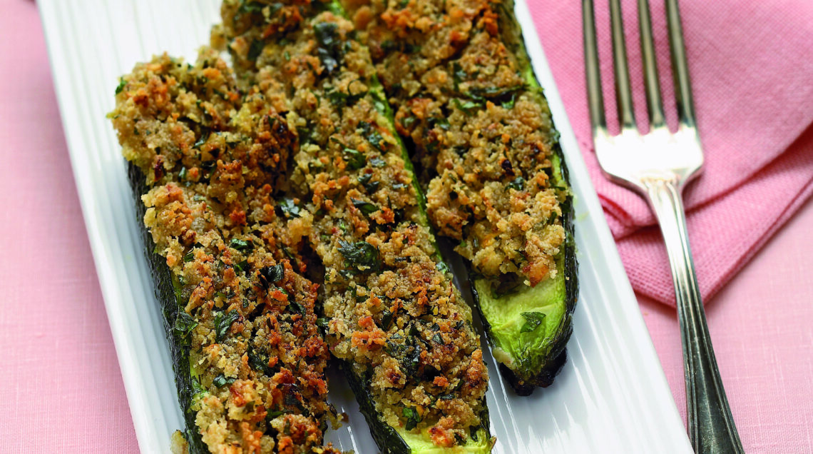 3 Distribuite la farcia nelle zucchine, passando sulla superficie i rebbi di una forchetta. Imburrate una pirofila, collocatevi le zucchine affiancate, irroratele con poco olio e distribuitevi una manciata di pangrattato.