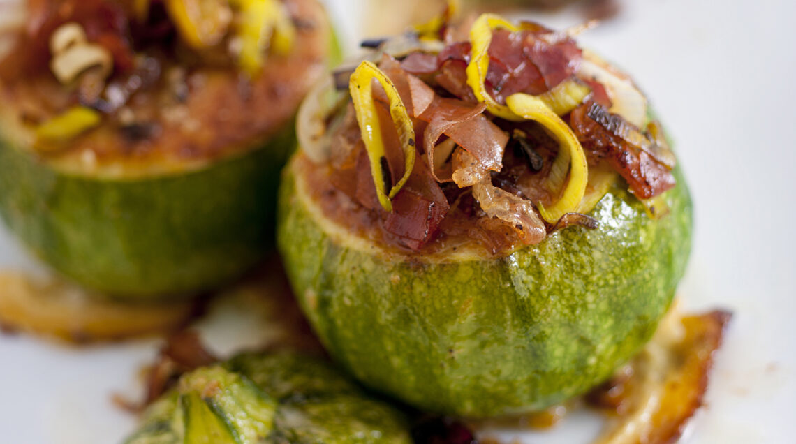 1) La ricetta zucchine ai porri e speck ti permette di avere un contorno saporito con cui accompagnare i secondi piatti. Lava le zucchine e poi cuocile intere immergendole in acqua bollente e salata per 8 minuti. Passale in acqua e ghiaccio per qualche attimo. Togli la calotta superiore e scava un po’ del contenuto delle zucchine tonde.