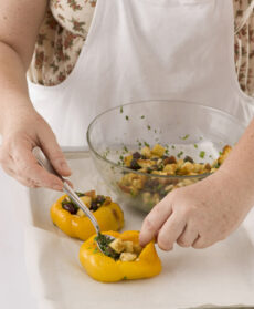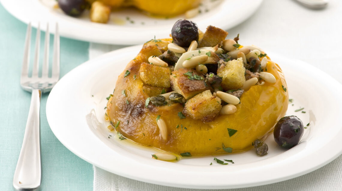 Questo piatto è un gioco di consistenze: peperoni teneri, ripieno polposo e pane croccante. Superbi anche tiepidi