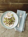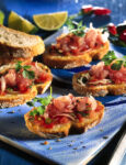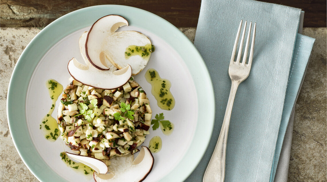 3) Completa. Distribuisci la tartare di porcini alle acciughe e noci nei piatti servendoti di un anello, decora con le fettine di funghi tenute da parte e servi.