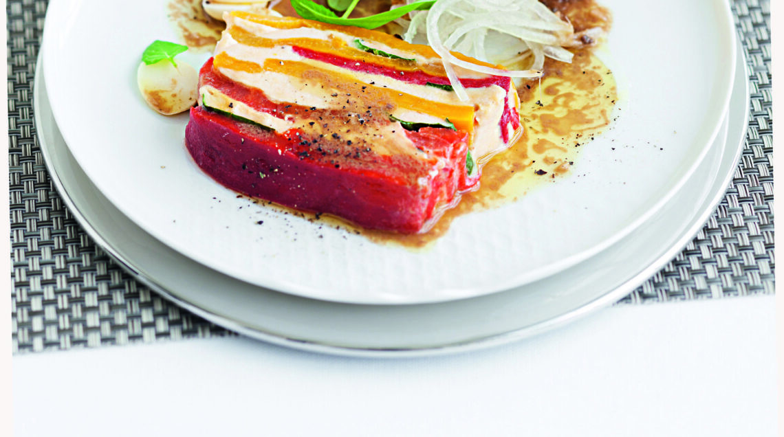 1) Sgocciola bene i cannellini dal liquido di conservazione e passali al mixer con il tonno sbriciolato, un pizzico di sale e una macinata di pepe. Rivesti una terrina rettangolare con un foglio di carta da forno. Disponi a strati le falde di peperone, la crema di cannellini e qualche foglia di menta e di basilico. Appoggia un peso sulla terrina e fai raffreddare per 4-5 ore.