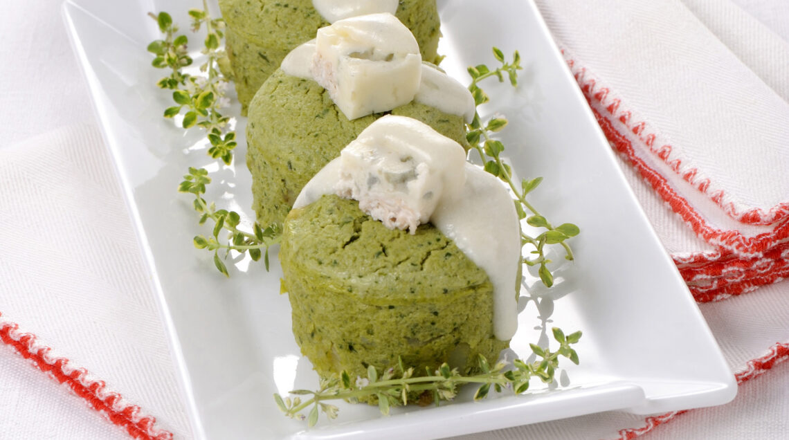 4) Sforma i tortini, guarniscili con un dadino di formaggio e nappa con la fonduta.