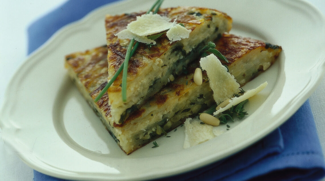 2) Aiutandoti con il coperchio gira la torta, e rimettila in padella con il burro rimasto, quindi prosegui la cottura della torta di patate al parmigiano reggiano per 10 minuti. Servila calda.