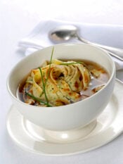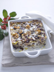 4) Metti metà del burro in una padella antiaderente del diametro di 20 cm, aggiungi le patate sgocciolate e salate disponendole in strati, poi unisci le erbe, il formaggio e i pinoli. Termina la torta con un ultimo strato di patate.