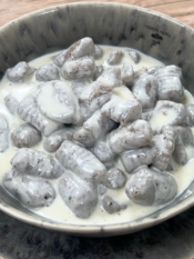 1 Mettete la toma a pezzi nel latte per un'ora. Fate bollire per 5 minuti un dl di acqua con qualche foglia di timo e di maggiorana, il sedano, lo scalogno, il vino, sale e pepe. Pulite i funghi e scottateli per 7 minuti nel brodo; strizzateli e affettateli.