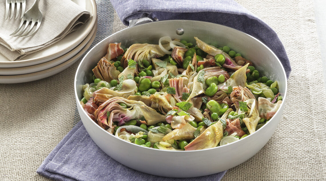 1 Pulite i carciofi (anche i gambi), tuffandoli man mano in acqua e succo di limone. Sgranate i piselli e anche le fave, se non sono tenerissime sbucciatele a crudo o sbollentandole per alcuni istanti. Tagliate i cipollotti a rondelle.