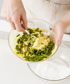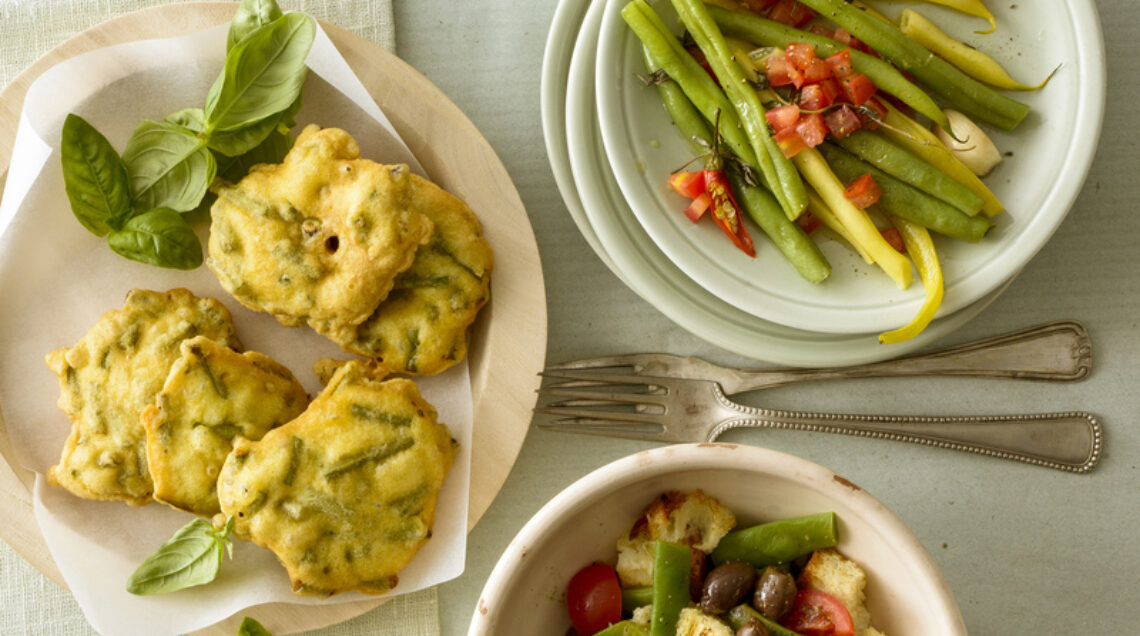Sbattete 1 uovo intero e 1 tuorlo (tenete da parte l'albume) con un pizzico di sale, amalgamatevi 4 cucchiai di farina e diluite con acqua minerale gasata ben fredda fino a ottenere una pastella densa. Mescolate alla pastella 200 g di fagiolini fini prelessati e tagliati a pezzetti.