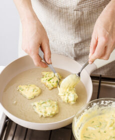 Amalgamate al composto l'albume montato a neve, raccoglietelo, a cucchiaiate, e friggetele, poche alla volta, in abbondante olio ben caldo. Dopo pochi secondi girate le frittelle e, appena dorate, scolatele su carta assorbente e servitele.