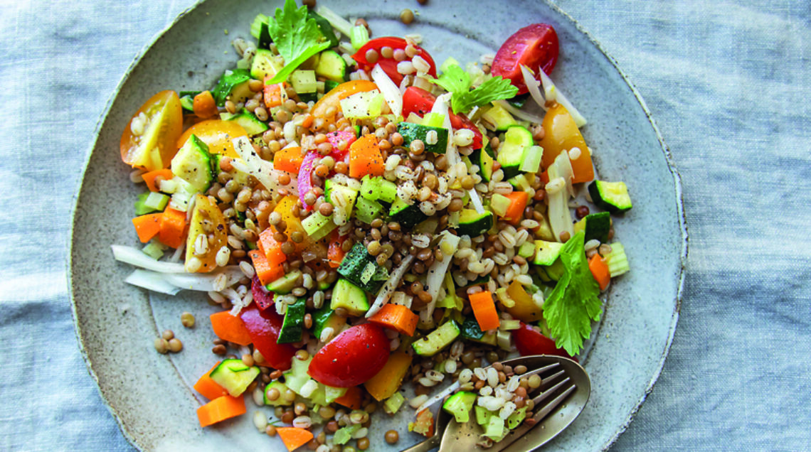 Si tratta di una ricetta ricca di fibre, semplice da realizzare e ottima per l'estate. Il piatto perfetto per un pranzo estivo e per chi ama il gusto di cereali e legumi come lenticchie e orzo, qui abbinati a verdure quali pomodorini, carote e zucchine. Inoltre, per arricchire il gusto del piatto viene aggiunto del prosciutto crudo.