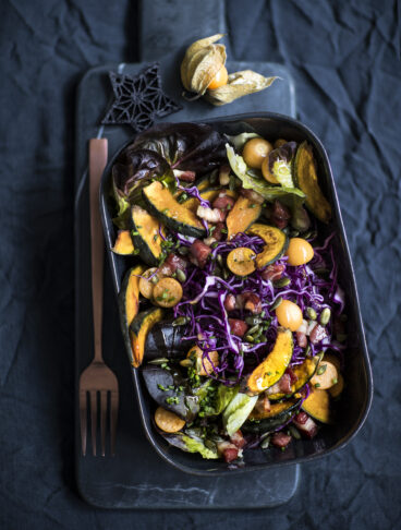 La creatività non manca in questo piatto semplice, colorato e raffinato. Un mix ben riuscito tra la dolcezza della frutta, l'amarognolo della rucola e la cremosa sapidità del formaggio
